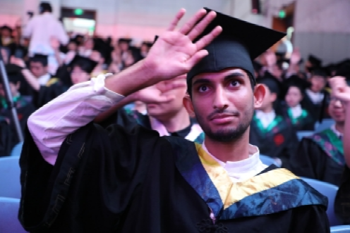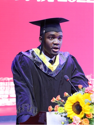 Geng Yuanyuan, a graduate from School of Education,and Glenn Stevy NDINGA, a foreign graduate from School of Mechanical and Electrical Engineering, delivered their remarks as student representatives.